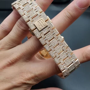 Đồng hồ Audemars Piguet Oak rose gold 18k kim cương thiên nhiên sở hữu ngoại hình cực ky bảnh bao. Bộ khung vỏ được hoàn thiện tỉ mẫn bằng chất liệu vàng hồng 18k độc quyền bản hãng. Dây đeo đồng hồ cũng làm từ vàng hồng 18k đắt đỏ, sang trọng.