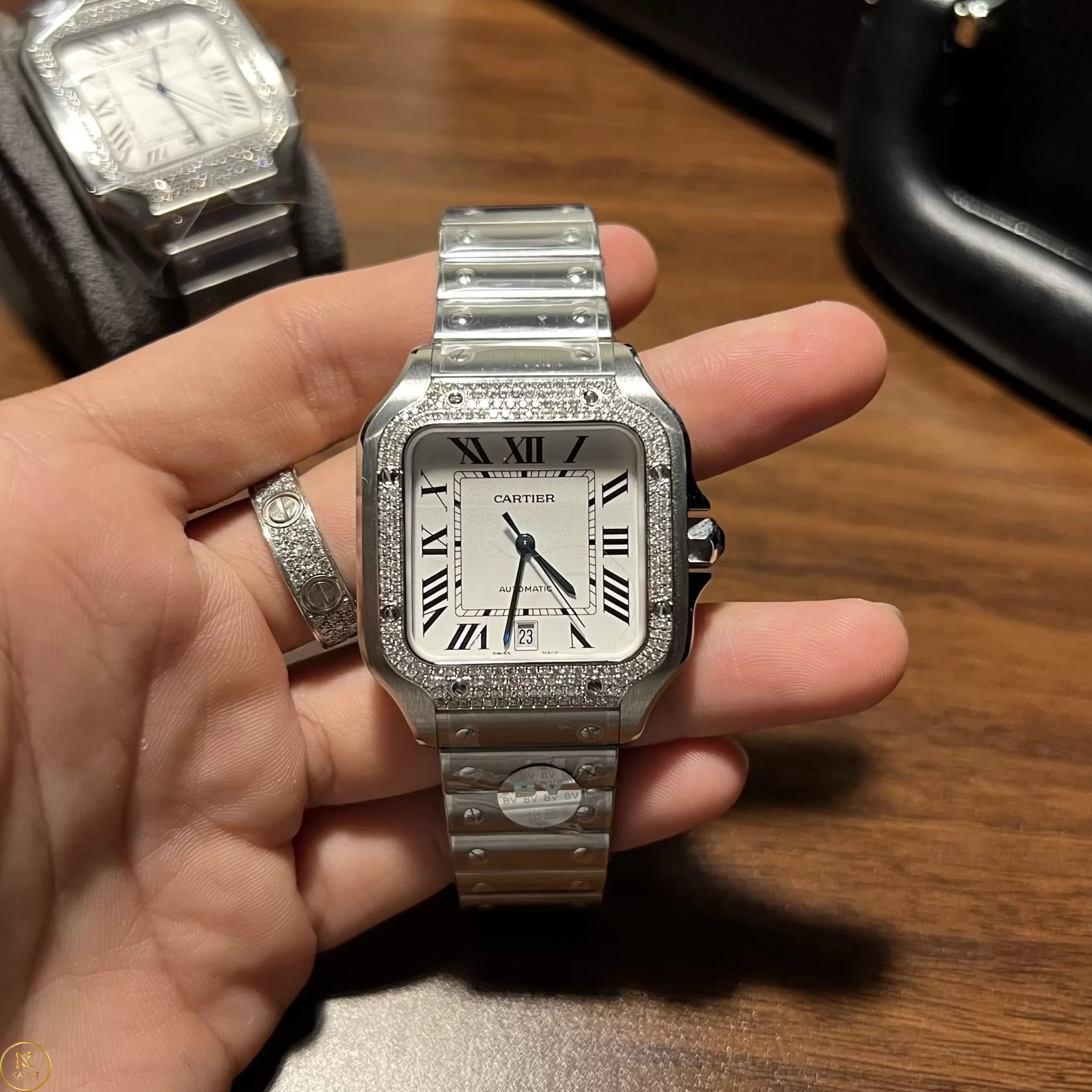 Không đắt đỏ như siêu phẩm bản hãng nhưng Cartier Santos rep 1:1 like auth độ viền kim cương lại không kém phần sang, xịn và mịn như phiên bản chuẩn auth. Đeo model này lên tay bạn sẽ trở thành tâm điểm của mọi ánh nhìn, tự tin, nổi bật hơn trước đám đông. Hãy ghé ngay Karat để kiểm chứng nhé!