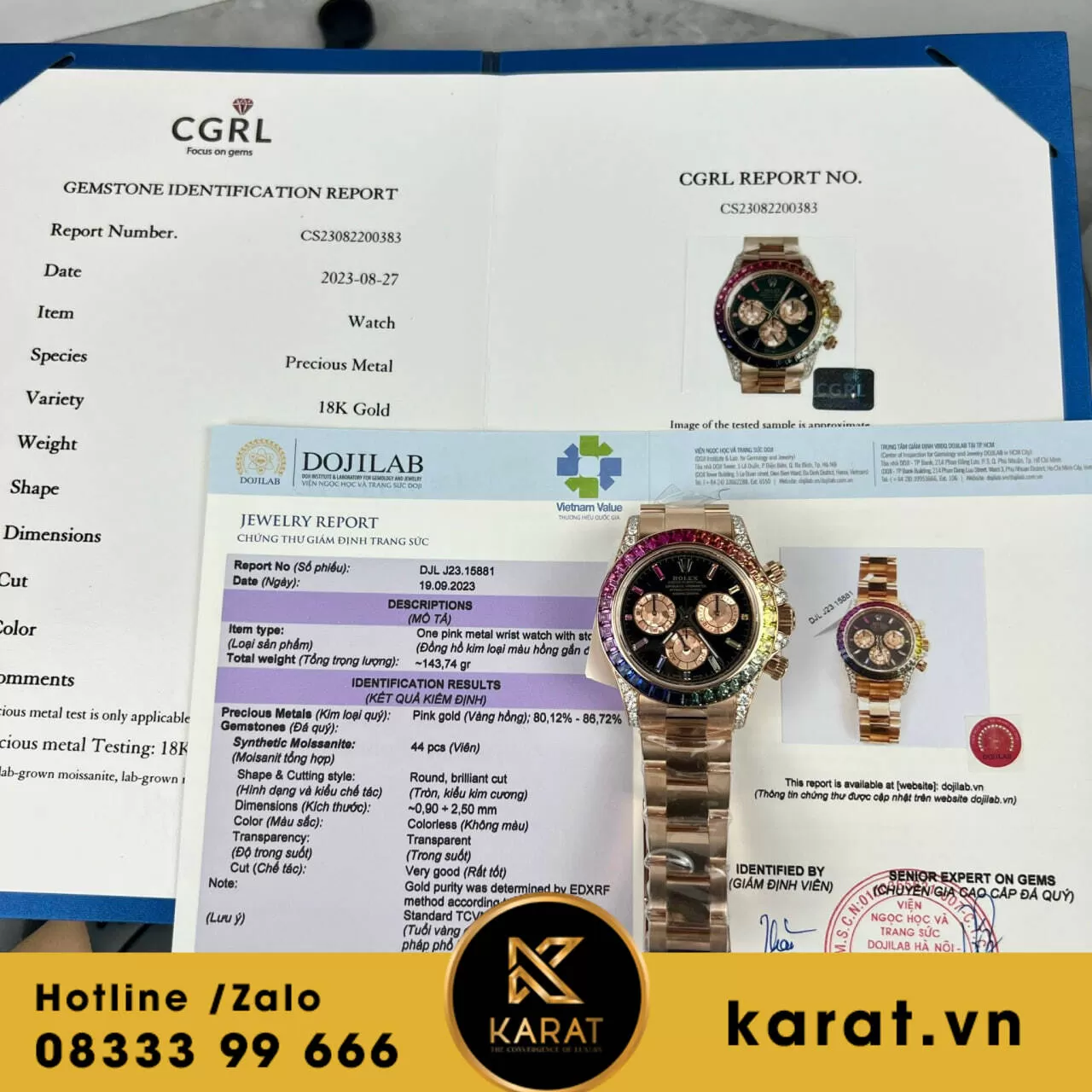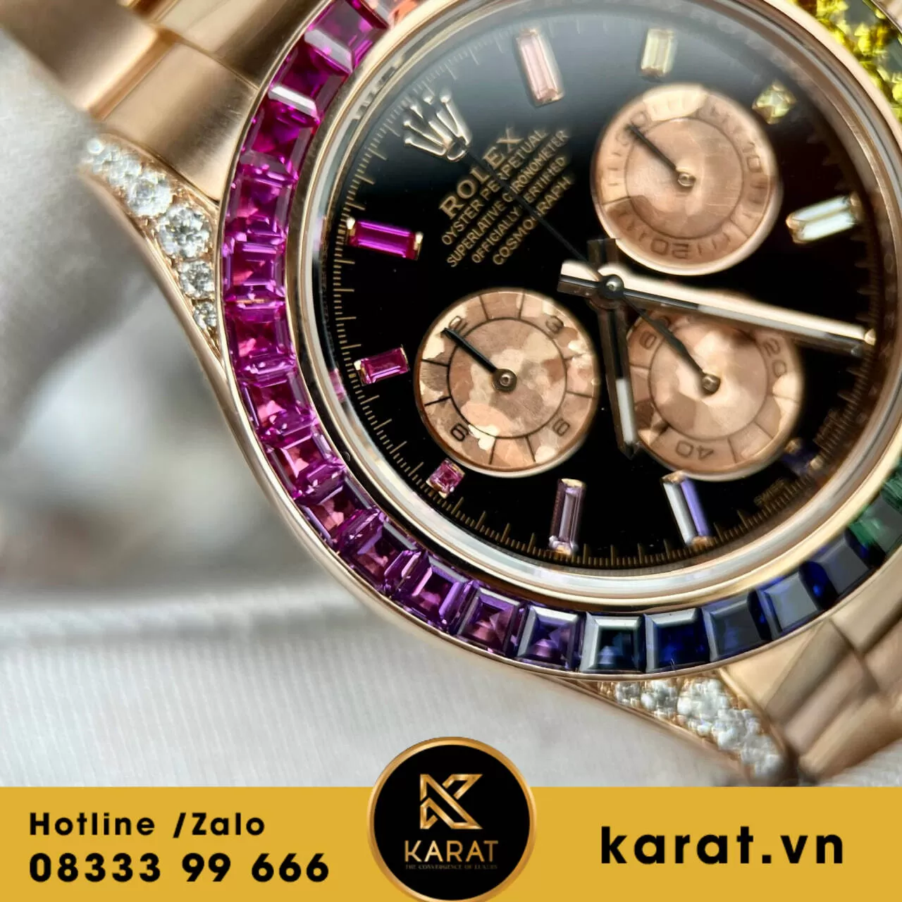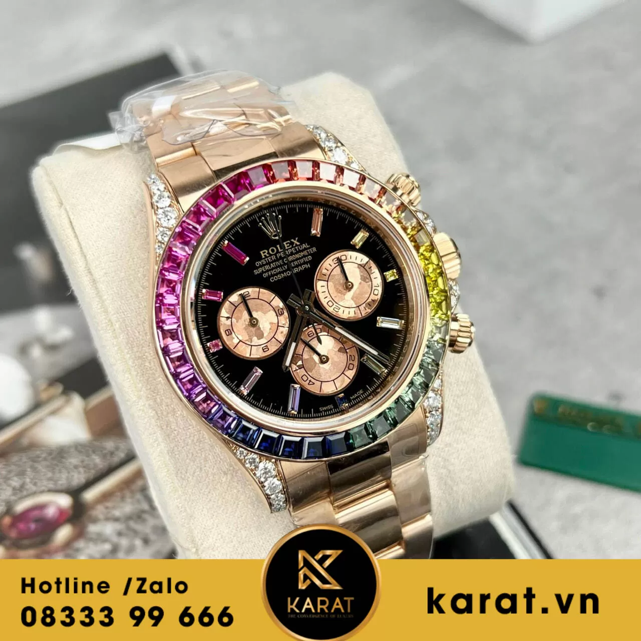 Hiện tại, đồng hồ Rolex Daytona Rainbow 116595 đang có sẵn tại karat.vn. Liên hệ với chúng tôi ngay hôm nay để sở hữu cho mình chiếc đồng hồ đẳng cấp này.