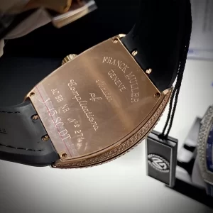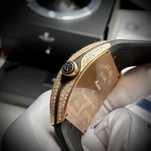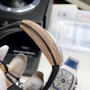 Lớp vỏ mẫu Đồng Hồ Franck Muller Vanguard rep 1:1 này chế tác từ Vàng Hồng 18k và kim cương lấp lánh. Đây là có chất liệu xa xỉ luôn được mọi người yêu thích và lựa chọn. Mặt số dáng dạng thùng kết hợp đường kính 41mm trở thành nét đặc trưng của Vanguard.