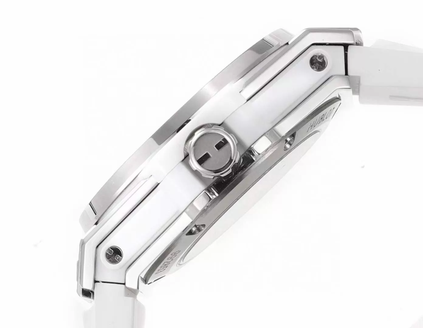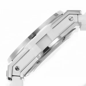 Đặc biệt, sử dụng 42 viên kim cương và mỗi đoạn đính 7 viên vừa rực rỡ vừa sang trọng. Núm điều chỉnh Đồng Hồ Hublot BIG BANG One Click Steel White Diamond 39MM Super Fake bên hông được khía rãnh. Quan sát thấy, mặt trên núm in logo thương hiệu giúp khách hàng dễ phân biệt.