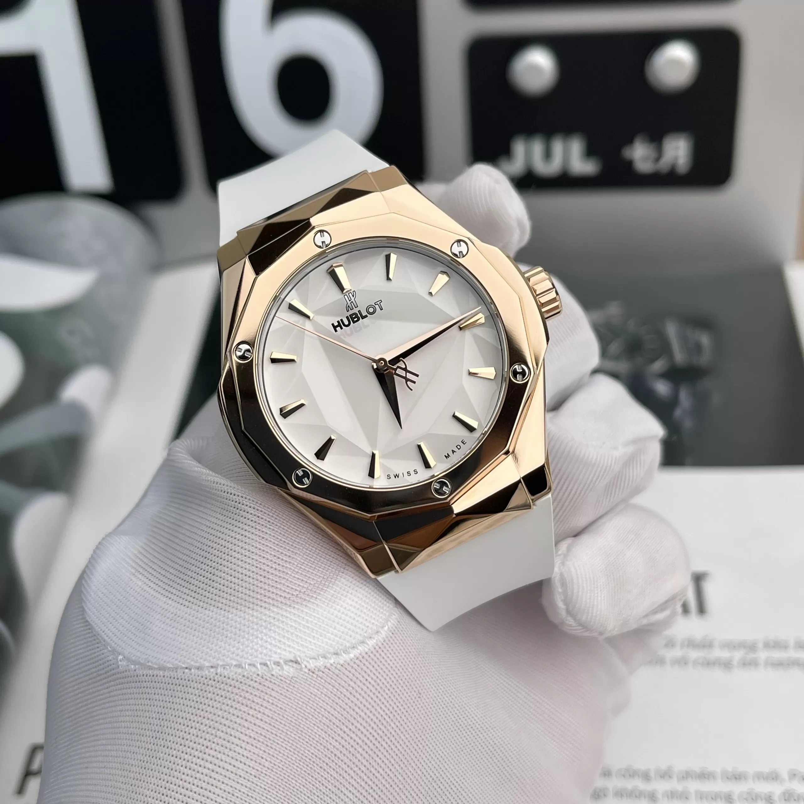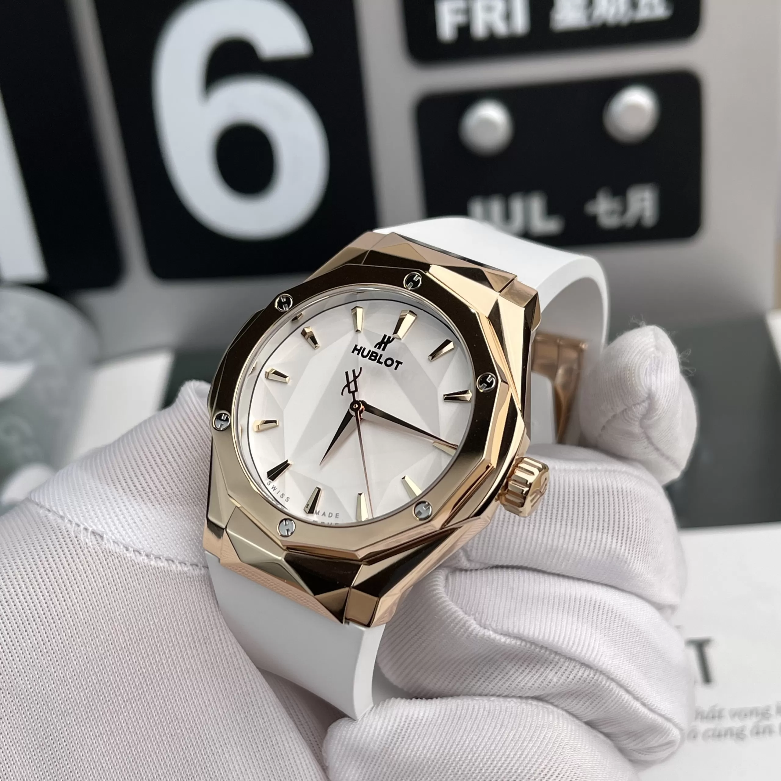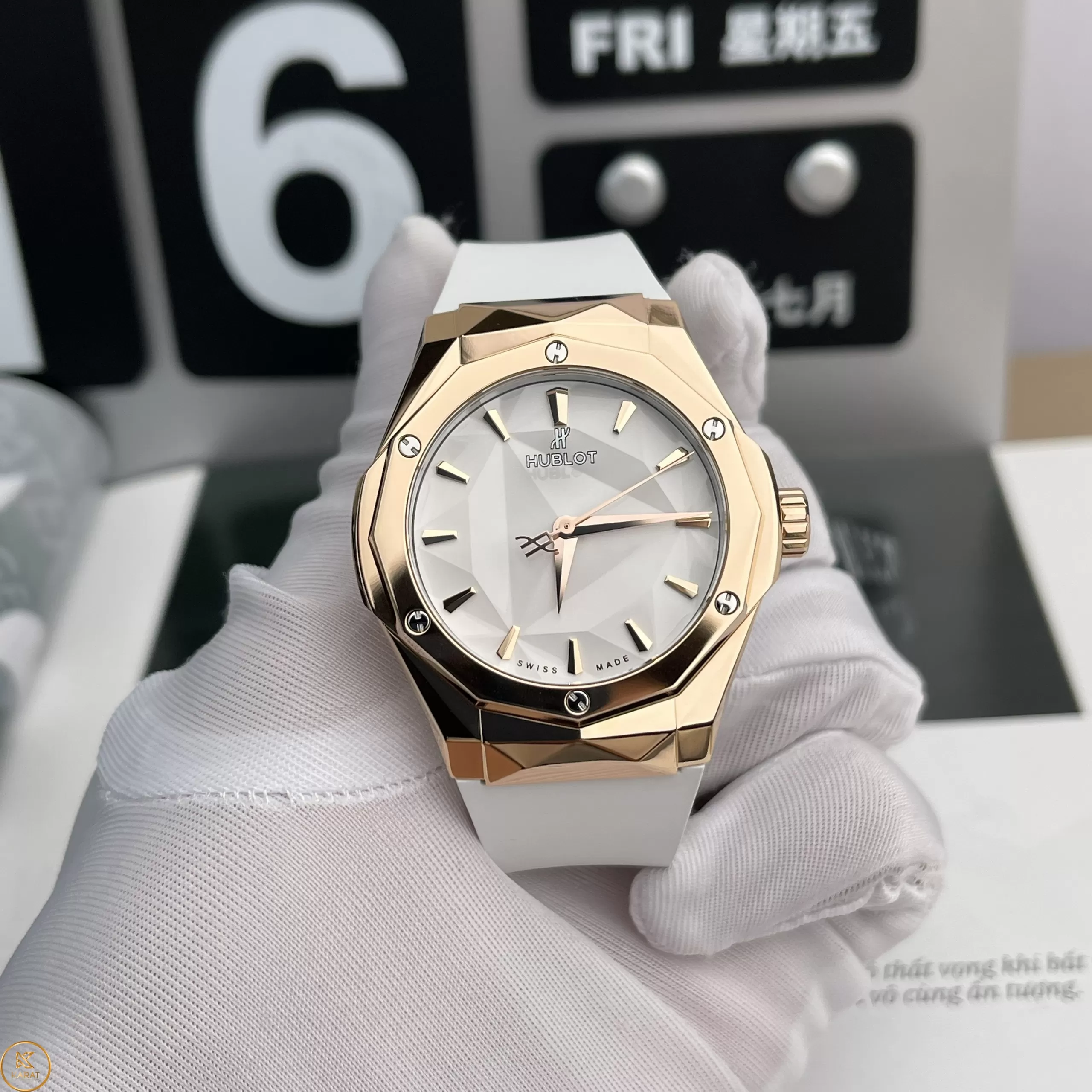 Mua đồng hồ Hubot replica ở đâu tin cậy đến với KARAT bạn sẽ bất ngờ khi bắt gặp phiên bản Đồng hồ Hublot Classic Fusion Orlinski King Gold 550. Để làm nổi bật lên sắc vàng của vành bezel, sản phẩm đã lựa chọn sắc trắng cho mặt số và dây đeo. Nhằm khắc phục tình trạng dễ bám bẩn dây đeo, nhà sản xuất đã dùng lớp tráng chuyên dụng.