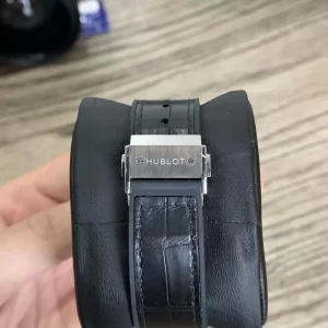 Lớp lót giữa 2 chi tiết này màu đen nổi bật trên tông nền màu trắng hấp lánh. Đồng Hồ Hublot Replica siêu cao cấp còn xuất hiện đinh vít Titanium ở càng nối dây. Công dụng kết nối vỏ đồng hồ với bộ dây cao su đặc trưng.