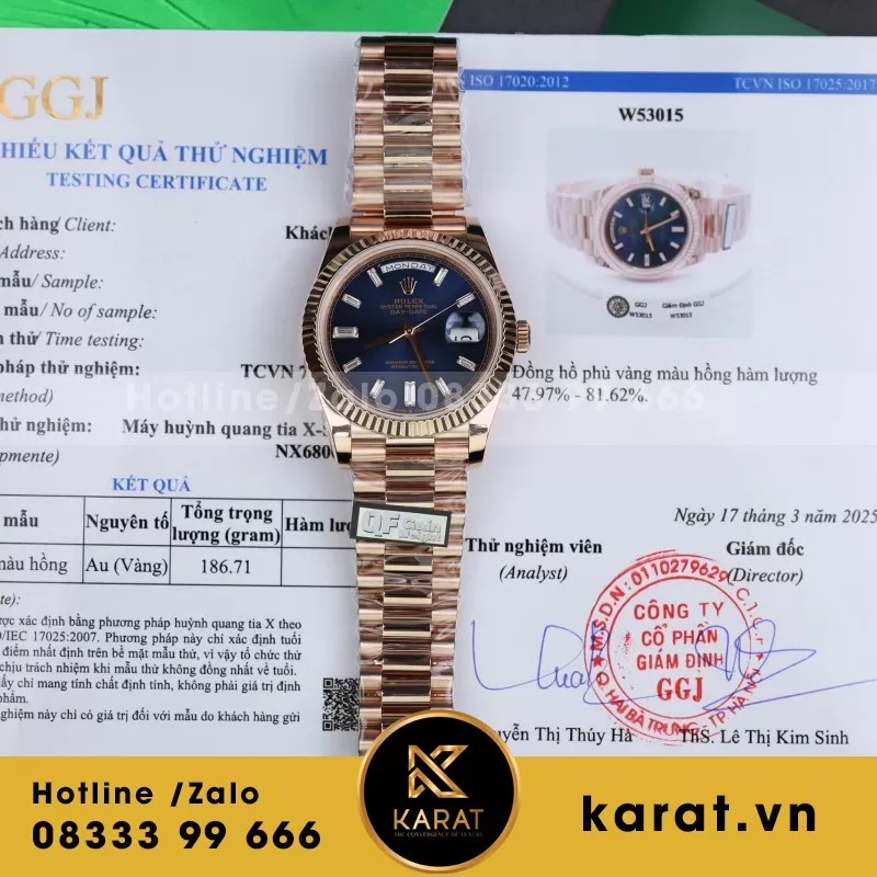 Với sự kết hợp hoàn hảo giữa kỹ thuật chế tác đỉnh cao và phong cách quý phái, đồng hồ Rolex Day-Date mặt xanh trọng lượng 186Gram bọc vàng thật 40mm khẳng định vị thế của một huyền thoại trong giới đồng hồ. Nếu bạn mong muốn sở hữu vẻ đẹp sang trọng ấy theo cách riêng, Karat.vn mang đến những phiên bản lấy cảm hứng được hoàn thiện tinh xảo, bọc vàng ấn tượng, chế độ bảo hành tận tâm. Truy cập Karat.vn ngay hôm nay để tìm kiếm chiếc đồng hồ thể hiện phong thái và đẳng cấp của chính bạn.