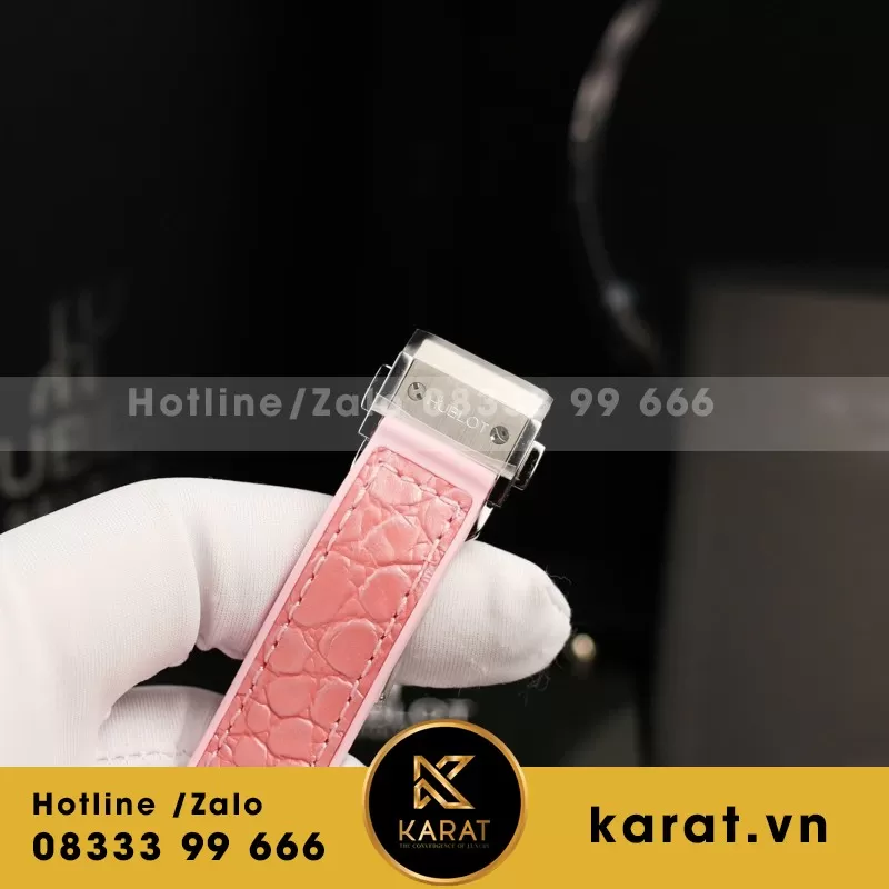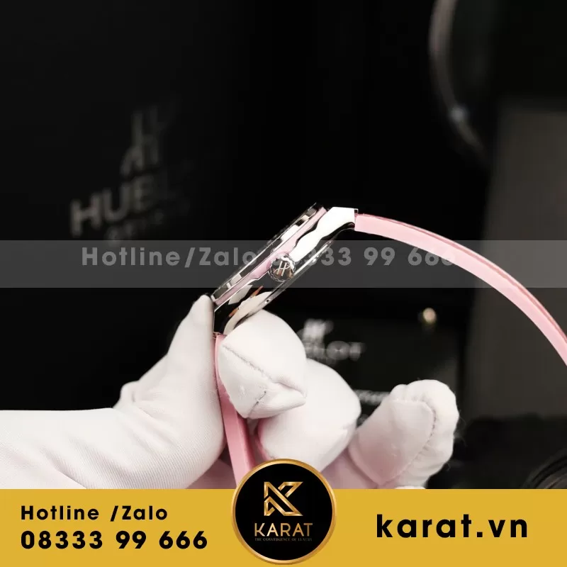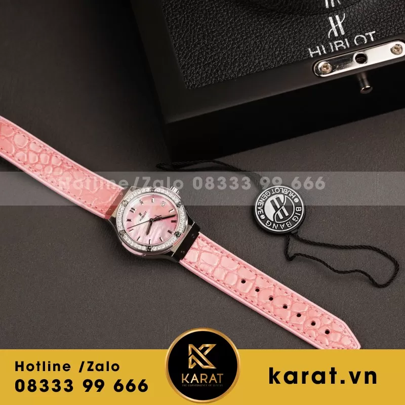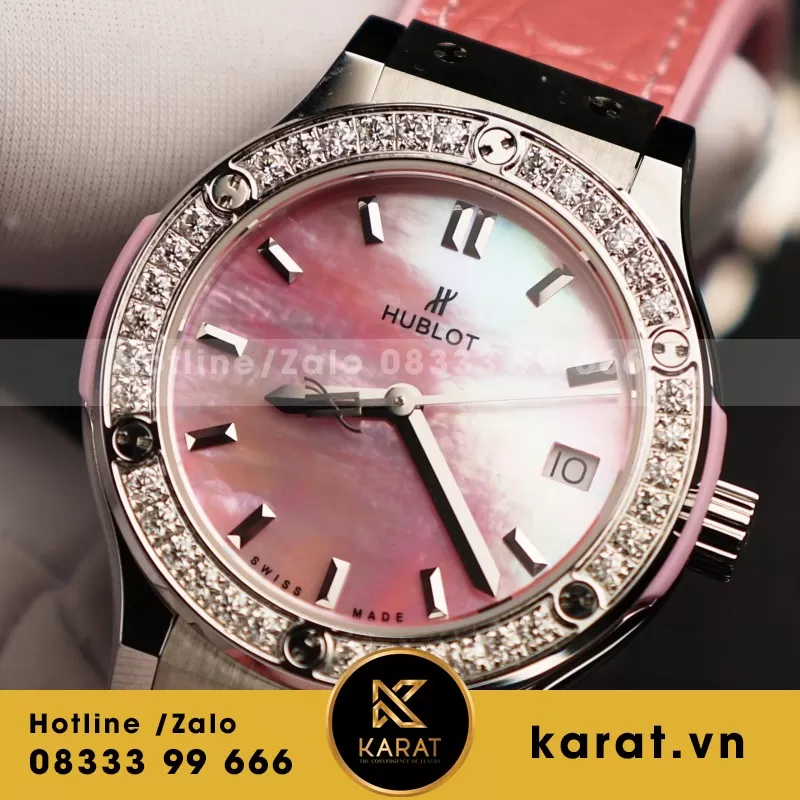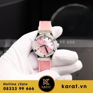 Đồng Hồ Nữ Hublot Classic Fusion Mặt Khảm Xà Cừ Màu Hồng Viền Đính Kim Cương Moissanite 33mm