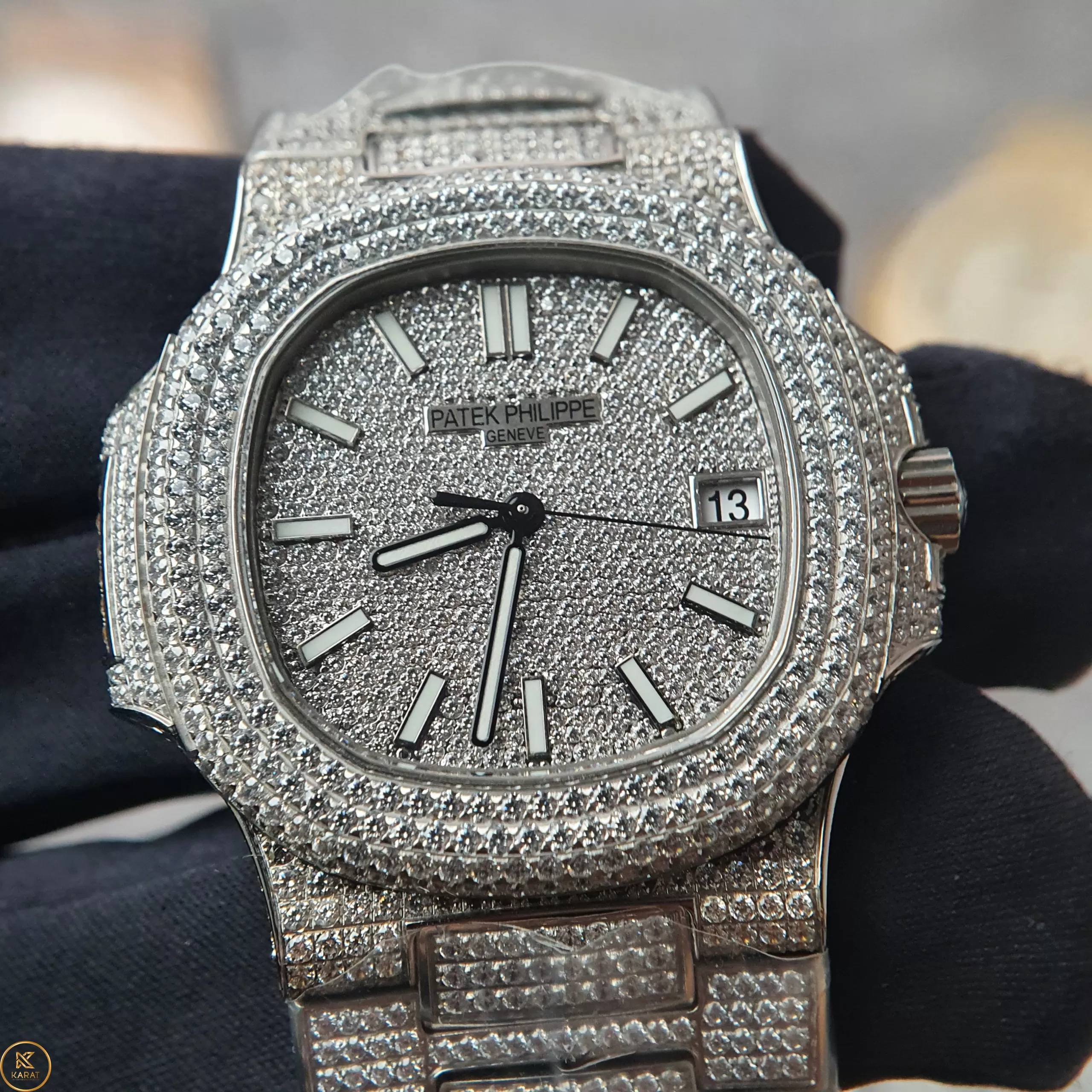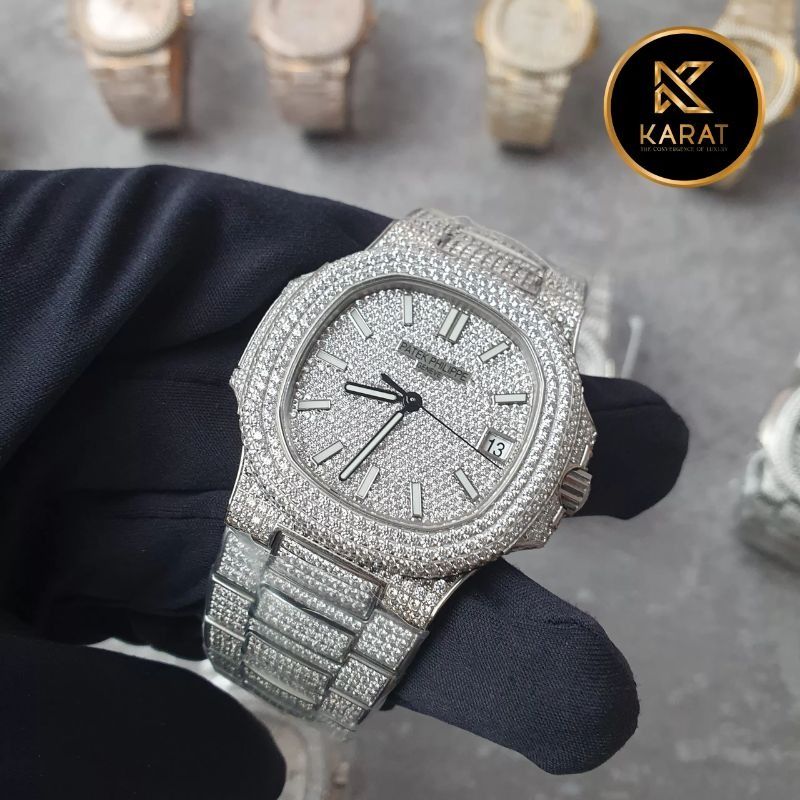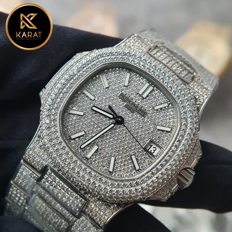 Đồng Hồ Patek Philippe Nautilus 5711 Like Auth Full Diamond là phiên bản tái hiện hoàn hảo của biểu tượng sang trọng bậc nhất trong thế giới đồng hồ. Toàn bộ thân vỏ, dây và mặt số đều được đính kín kim cương Moissanite Hong Kong cao cấp, mang đến vẻ đẹp rực rỡ, lấp lánh và cuốn hút khó cưỡng. Cùng Karat khám phá sức hút của kiệt tác thời gian này.