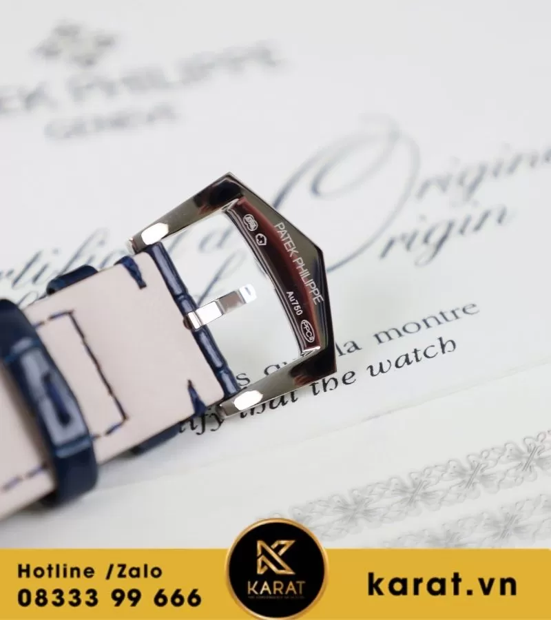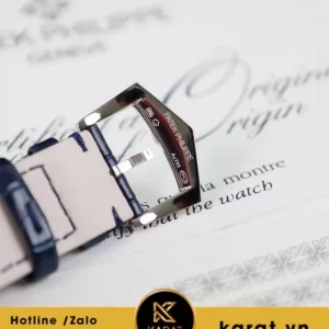 Dây da cá sấu xanh cao cấp được khâu thủ công tỉ mỉ, tạo cảm giác đeo mềm mại và ôm cổ tay. Khóa gập bạch kim khắc logo Patek Philippe, vừa đảm bảo an toàn vừa thể hiện gu thẩm mỹ tinh tế của chủ nhân.