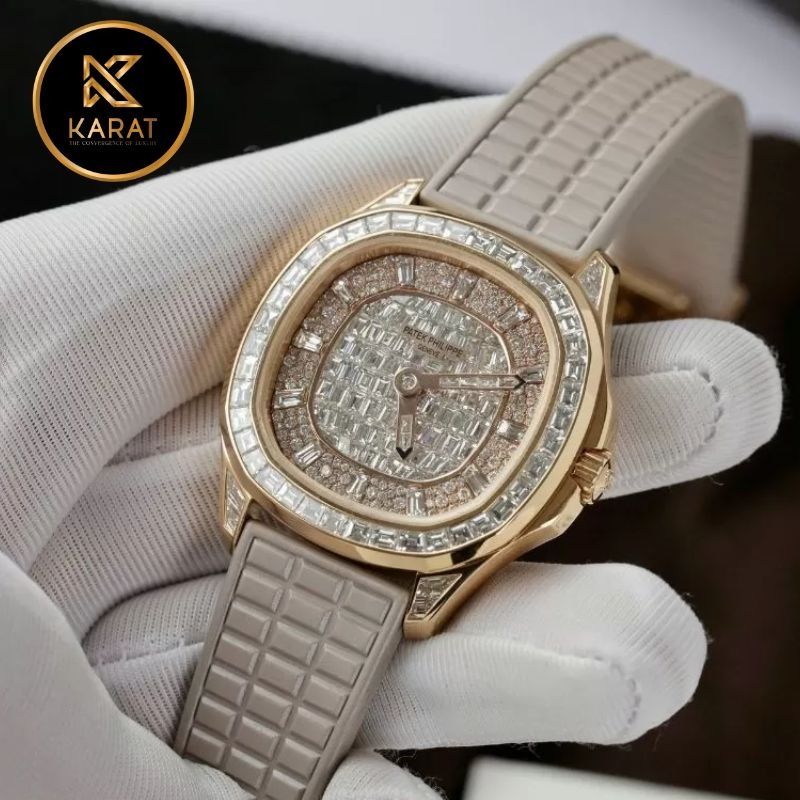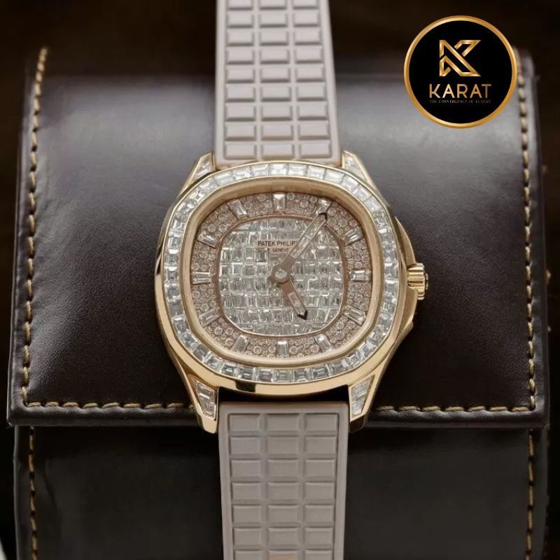 Patek Philippe Aquanaut 5062/450R-001 là biểu tượng của nghệ thuật chế tác đồng hồ xa xỉ đỉnh cao, nơi hội tụ giữa tinh tế, công nghệ và kim hoàn thượng hạng. Từng chi tiết được chạm khắc tỉ mỉ trên nền vàng khối 18K, điểm xuyết kim cương thiên nhiên baguette sang trọng. Cùng Karat.vn khám phá tuyệt phẩm này – món trang sức thể hiện đẳng cấp và vị thế của người sở hữu.