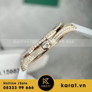 Bộ vỏ thép mạ vàng hồng đường kính 35.2mm mỏng nhẹ, bezel octagonal đính Moissanite baguette lấp lánh, mang độ bền cao và xa xỉ tinh xảo.