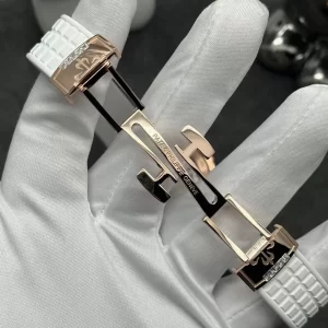 Dây cao su trắng cao cấp, chống nước và chống trượt, khóa gập vàng 18K ẩn. Thiết kế này đảm bảo sự thoải mái suốt ngày, dễ vệ sinh, phù hợp hoạt động ngoài trời.