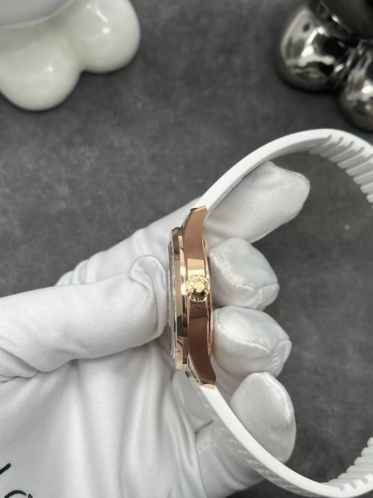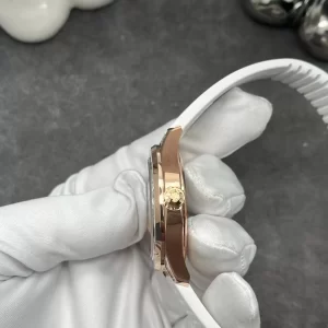 Bộ vỏ vàng 18K bóng bẩy, đường kính 40mm, dày 9mm, bezel khảm kim cương pavé tinh tế. Thiết kế này mang lại độ chắc chắn cao và sức hút lấp lánh, lý tưởng cho cổ tay nam giới.