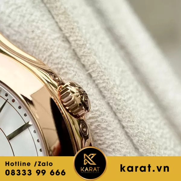 Vỏ 40mm mạ vàng 18K được gia công tỉ mỉ, đường viền mềm mại và cân đối. Sự kết hợp giữa các chi tiết cổ điển và hiện đại tạo ra tổng thể thanh lịch và đẳng cấp.