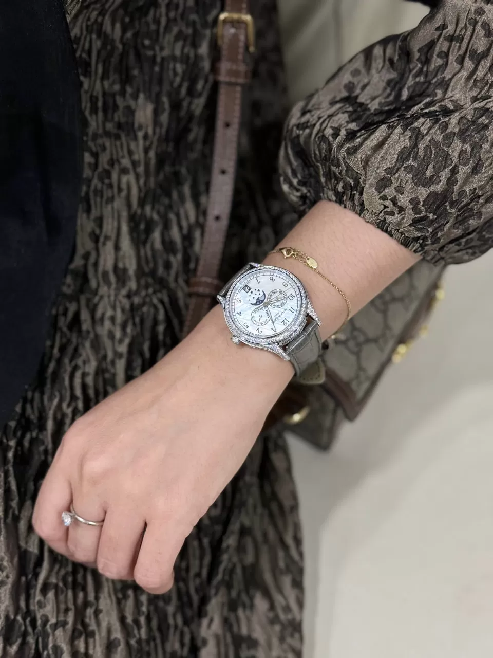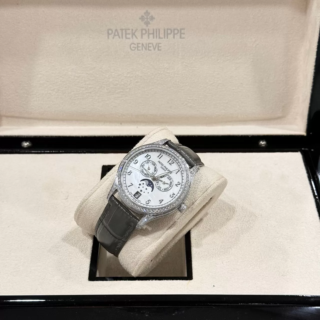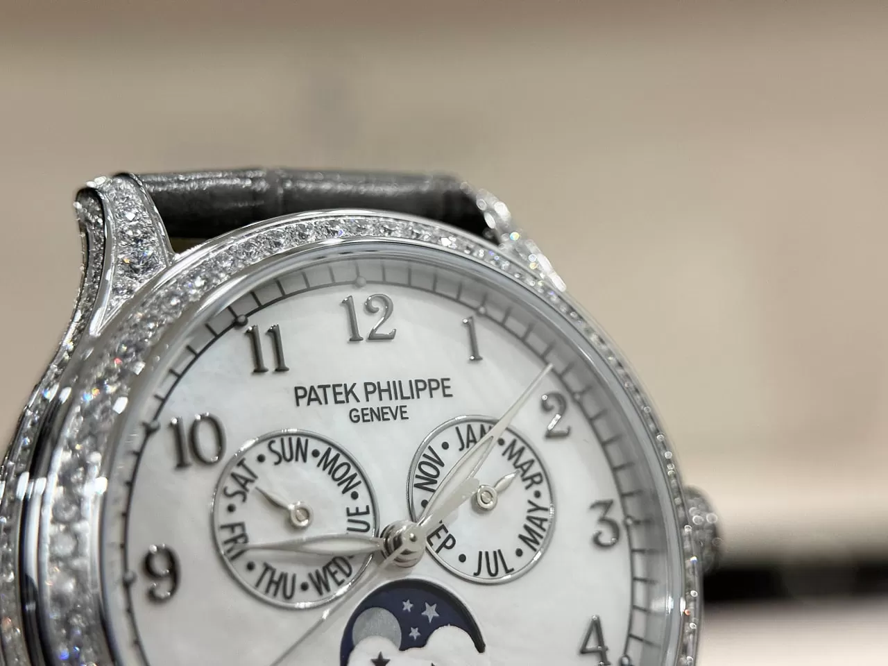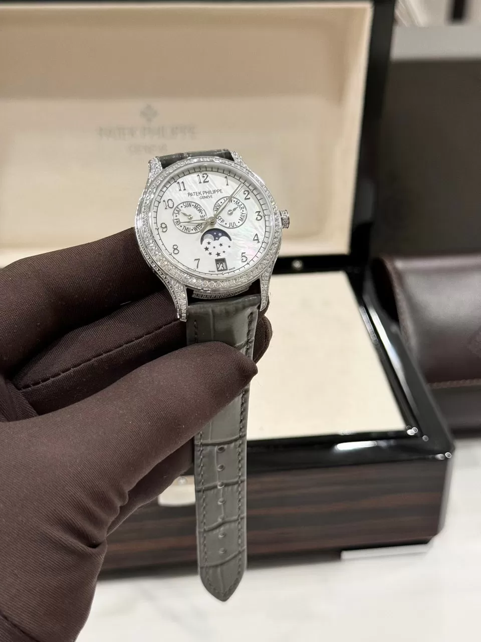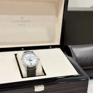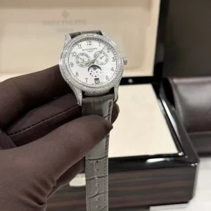 Đồng hồ Patek Philippe fake 1:1 Complications 4947R-001 diamond sở hữu kích thước 38mm, mang lại sự thanh lịch và phù hợp với mọi cổ tay. Thiết kế mặt số được đính đá 4 chân cao cấp, đảm bảo tính vững chắc và lấp lánh, tạo nên vẻ đẹp lộng lẫy và quý phái. Dây đeo bằng da cá sấu lên fom aut không chỉ bền bỉ mà còn mềm mại, mang lại sự thoải mái tối đa cho người đeo.