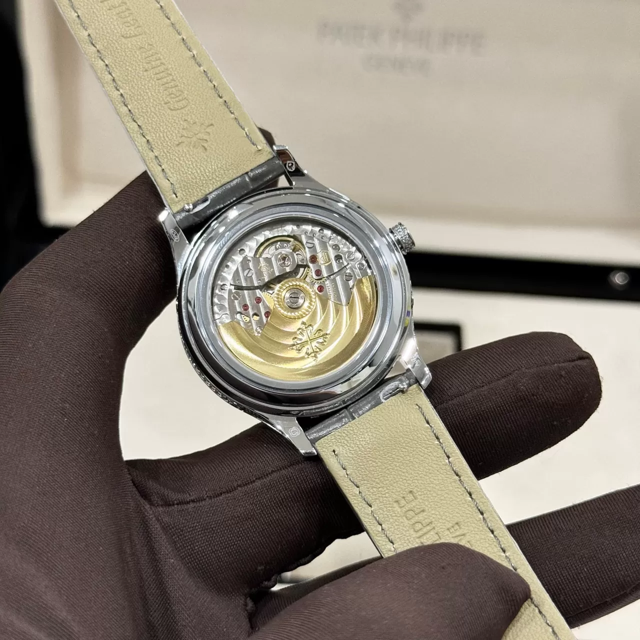 Bên trong chiếc đồng hồ này là bộ máy Thụy Sĩ 324 chuẩn aut, nổi tiếng với độ chính xác và độ bền cao. Hệ thống cơ tự động giúp đồng hồ luôn duy trì năng lượng mà không cần thay pin, thể hiện sự tiện lợi và đẳng cấp. Patek Philippe Complications 4947R-001 không chỉ là một chiếc đồng hồ, mà còn là một tác phẩm nghệ thuật cơ khí đáng tự hào.
