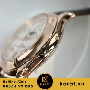 Vỏ rose gold 18K nguyên khối hình tròn bo cạnh mượt mà, bề mặt đánh bóng chống xước. Kích thước 40mm cân đối cổ tay, đảm bảo độ bền cao cấp.