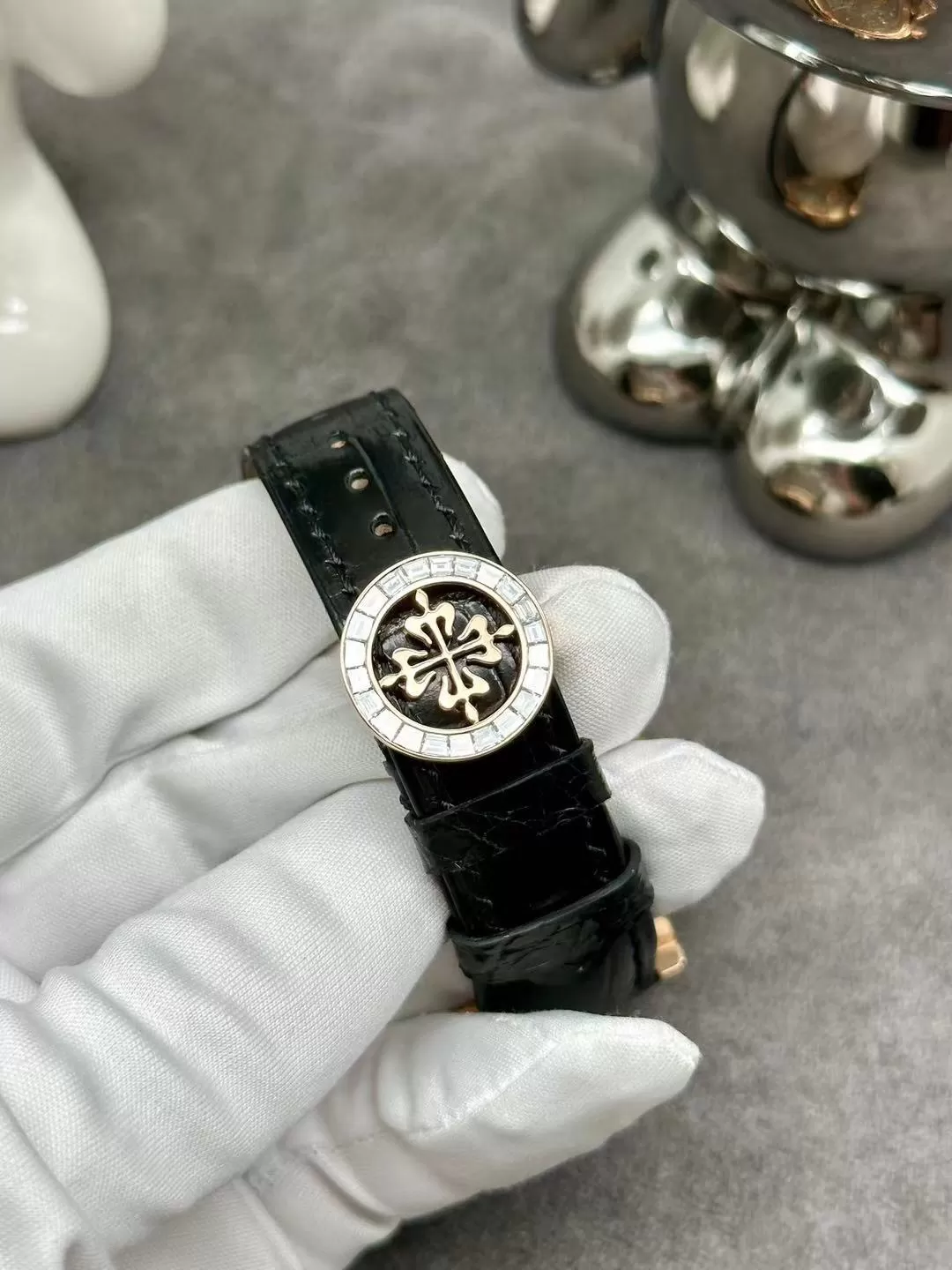 Dây da cá sấu đen cao cấp, mềm mại chống mài mòn, mang lại sự thoải mái tối ưu suốt ngày dài. Khóa gập xiên với logo hoa thị đặc trưng, dễ điều chỉnh và sang trọng.