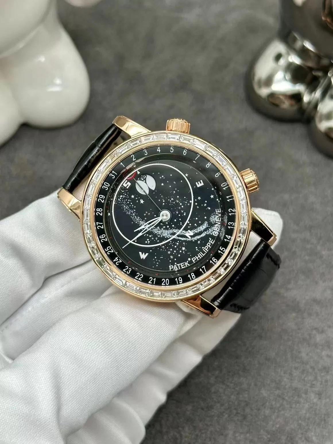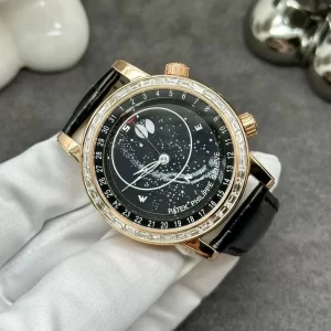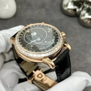 Đồng hồ Patek Philippe Grand Complications 6104R thuộc dòng Grand Complications danh tiếng, nổi bật với đường kính 43mm vừa vặn cổ tay nam. Phiên bản mặt thiên hà đen và dây da cao cấp mang đến vẻ đẹp vũ trụ huyền ảo, kết hợp lịch tuần trăng cùng moonphase thiên văn từ Bắc bán cầu.