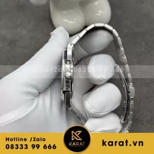 Dây đeo là vòng tay tích hợp platinum, các mắt xích được chải xước ngang tinh xảo, khóa gập an toàn. Thiết kế này mang lại sự thoải mái lâu dài cho cổ tay, đồng thời nâng tầm vẻ ngoài tổng thể.