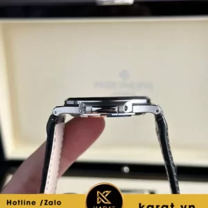 Tông xám ánh khói đầy cuốn hút, kết hợp các đường vân ngang mềm mại – nét nhận diện không thể nhầm lẫn của Patek Philippe. Cọc số và bộ kim phủ dạ quang trắng tạo độ tương phản rõ rệt, giúp quan sát dễ dàng cả trong môi trường thiếu sáng. Ô cửa sổ hiển thị lịch ngày ở vị trí 3 giờ tinh tế và tiện lợi.