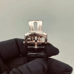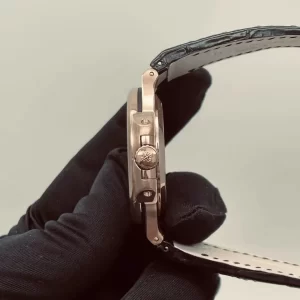 Bộ vỏ vàng hồng 18K chế tác mịn màng, kích thước 40mm x 8.3mm, mang lại cảm giác chắc chắn nhẹ nhàng. Bezel octagonal với họa tiết vít ngang, kính sapphire chống xước hai mặt, chống nước cực tốt, lý tưởng cho hoạt động đa dạng.
