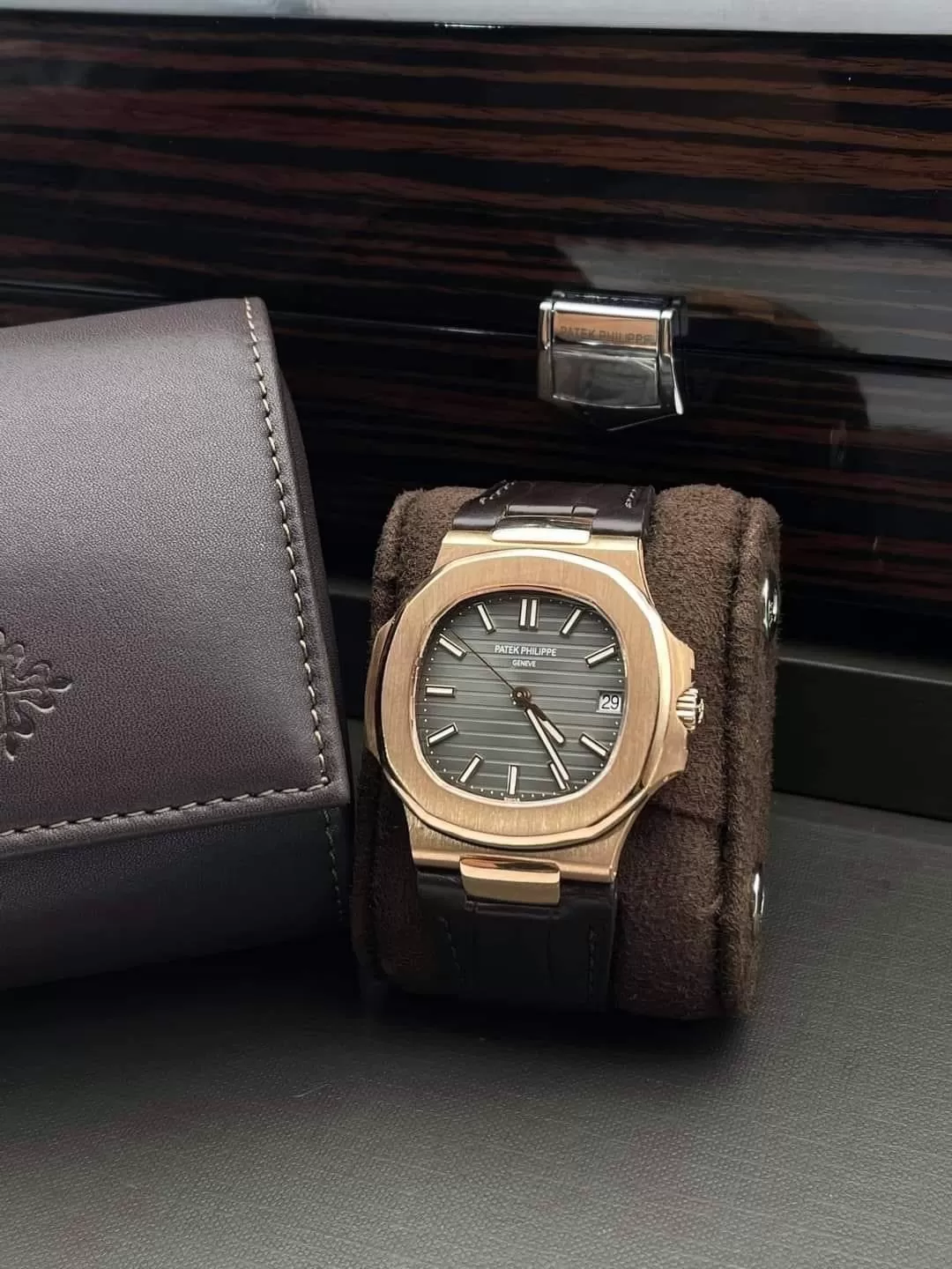 Mặt số đen sunburst mịn màng, kim luminous dễ đọc với cọc giờ ngang, cửa sổ ngày tại 3 giờ, tạo sự hài hòa cho chiếc đồng hồ Patek Philippe Super Fake.