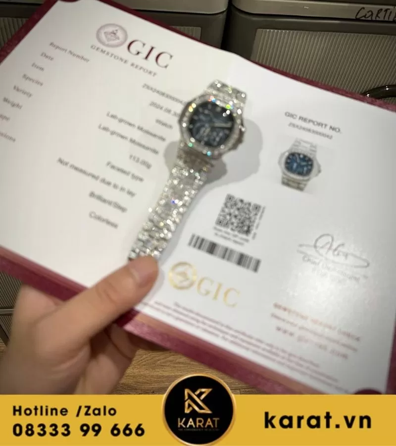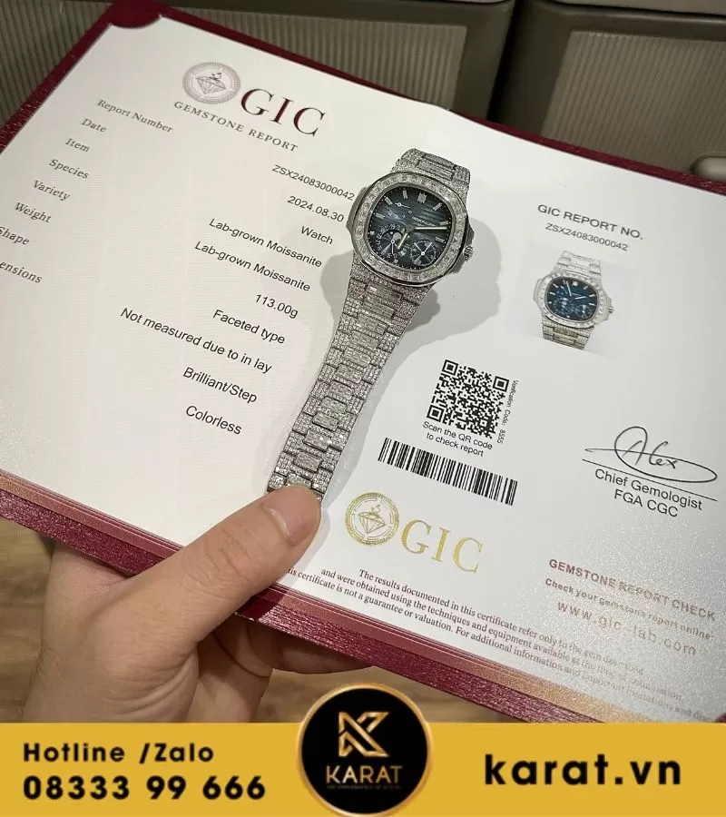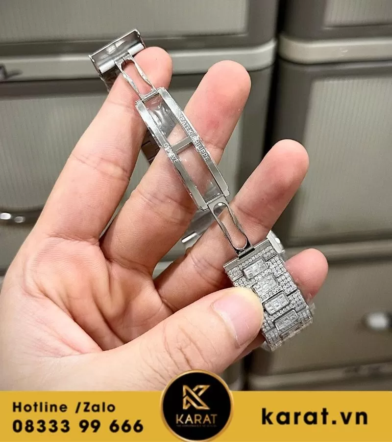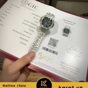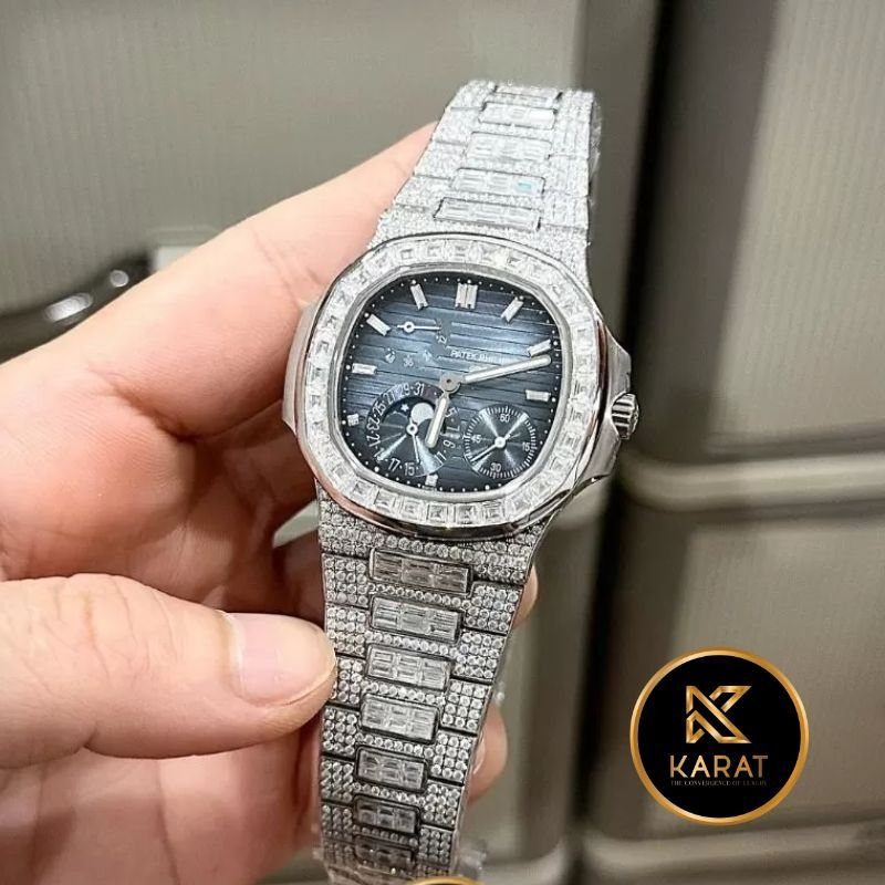 Đồng hồ Patek Philippe nautilus 5712 custom full moissanite là biểu tượng hoàn hảo của sự sang trọng và tinh tế, được chế tác dành cho những tín đồ đồng hồ đích thực. Với thiết kế độc đáo, đính toàn bộ moissanite sáng lấp lánh, mẫu đồng hồ này không chỉ là công cụ xem giờ mà còn là món trang sức giá trị. Cùng Karat khám phá vẻ đẹp và sự đẳng cấp mà chiếc đồng hồ này mang lại.
