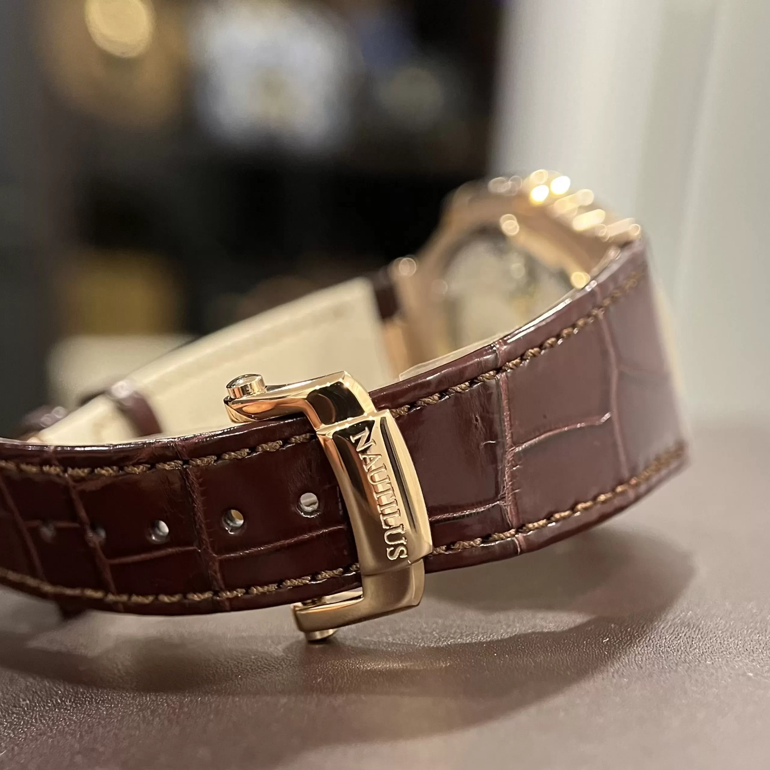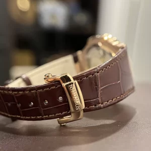 Dây da cá sấu nâu bóng cao cấp rộng 20mm mềm mại ôm sát, khóa gập vàng hồng an toàn, mang đến sự thoải mái lâu dài và dễ dàng phối hợp trang phục.