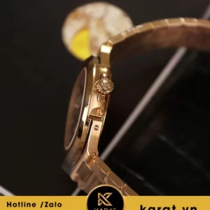 Sản phẩm sở hữu bộ vỏ 40mm được bọc vàng 18K cao cấp, hoàn thiện tỉ mỉ bằng kỹ thuật đánh bóng xen kẽ phay xước đặc trưng của dòng Nautilus. Vỏ thép cao cấp giúp tổng thể vừa chắc chắn, vừa mang độ bóng sang trọng, phản chiếu ánh sáng tinh tế trên cổ tay người đeo.