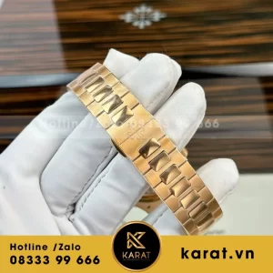 Dây đeo bằng thép mạ vàng hồng đồng bộ với bộ vỏ, tạo nên sự liền mạch hoàn hảo. Các mắt dây được đánh bóng xen kẽ chải xước, mang lại cảm giác sang trọng và thoải mái khi đeo.