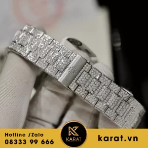 Dây thép không gỉ liền mạch với vỏ, được nạm kín kim Moissanite toàn bộ, mang đến vẻ ngoài đồng bộ và sang trọng. Khóa gập đôi chắc chắn, khắc nổi logo thương hiệu, giúp đồng hồ ôm tay nhẹ nhàng mà vẫn đảm bảo độ bền cao.