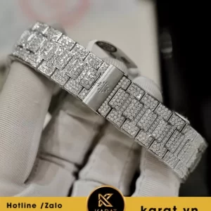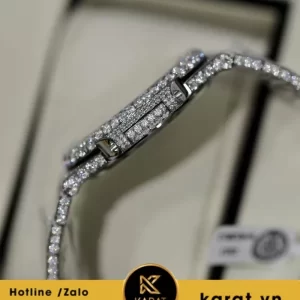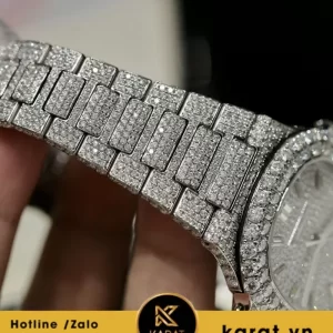 Đồng hồ Patek Philippe Nautilus 5719 kế thừa tinh thần thể thao sang trọng từ Gerald Genta, lấy cảm hứng từ cửa sổ tàu biển với chức năng theo dõi thời gian toàn cầu. Phiên bản custom full moissanite này nổi bật với vỏ thép 40mm đính hơn 1000 viên moissanite (~5ct), phù hợp cho cả hoạt động hàng ngày lẫn sưu tầm. Sản phẩm khẳng định vị thế của Patek Philippe Nautilus như biểu tượng cao cấp, nhấn mạnh sự hài hòa giữa truyền thống và sáng tạo.