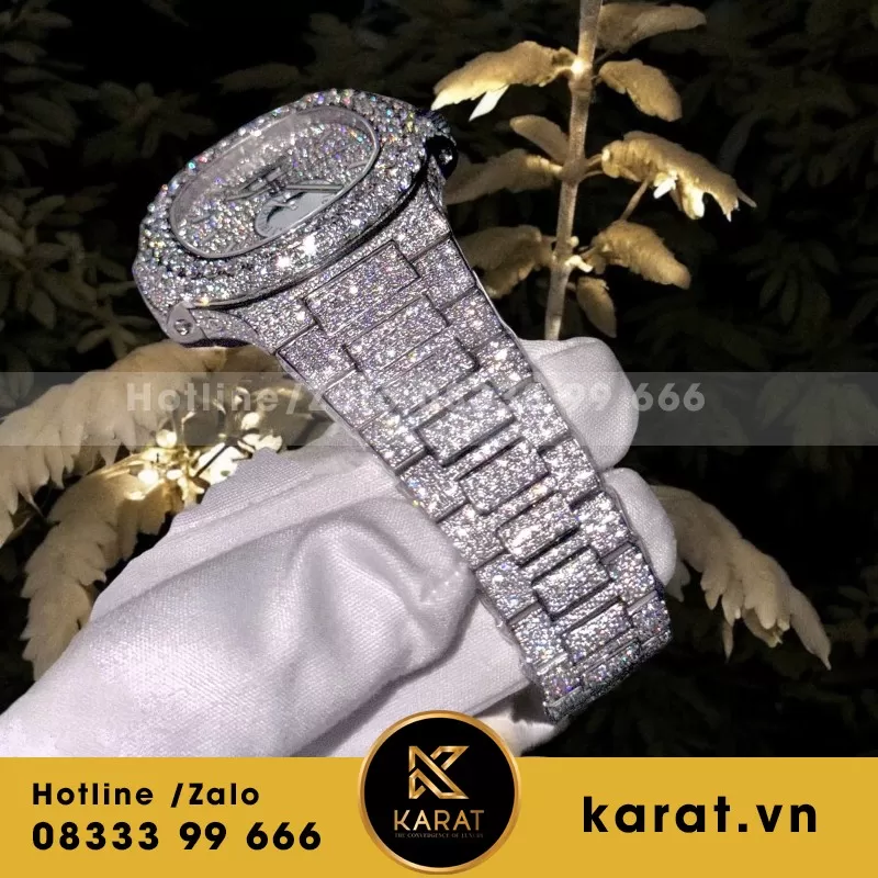 Karat.vn chuyên chế tác đồng hồ lấy cảm hứng từ Patek Philippe Nautilus 5719, kết hợp kỹ thuật thủ công đỉnh cao cùng nghệ thuật đính đá full moissanite tinh xảo. Mỗi chi tiết đều được hoàn thiện tỉ mỉ bởi đội ngũ nghệ nhân giàu kinh nghiệm, mang đến sản phẩm vừa sang trọng, vừa tinh tế. Cùng với dịch vụ tư vấn cá nhân hóa, bảo hành tận tâm, Karat.vn giúp bạn dễ dàng sở hữu một chiếc đồng hồ thể hiện đẳng cấp và phong cách riêng.