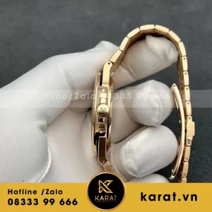 Dây đeo vàng đúc 18K đồng màu với thân vỏ, mang lại tổng thể liền mạch, quý phái. Cấu trúc khóa gập chắc chắn, tiện lợi cho việc sử dụng thường ngày.