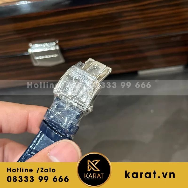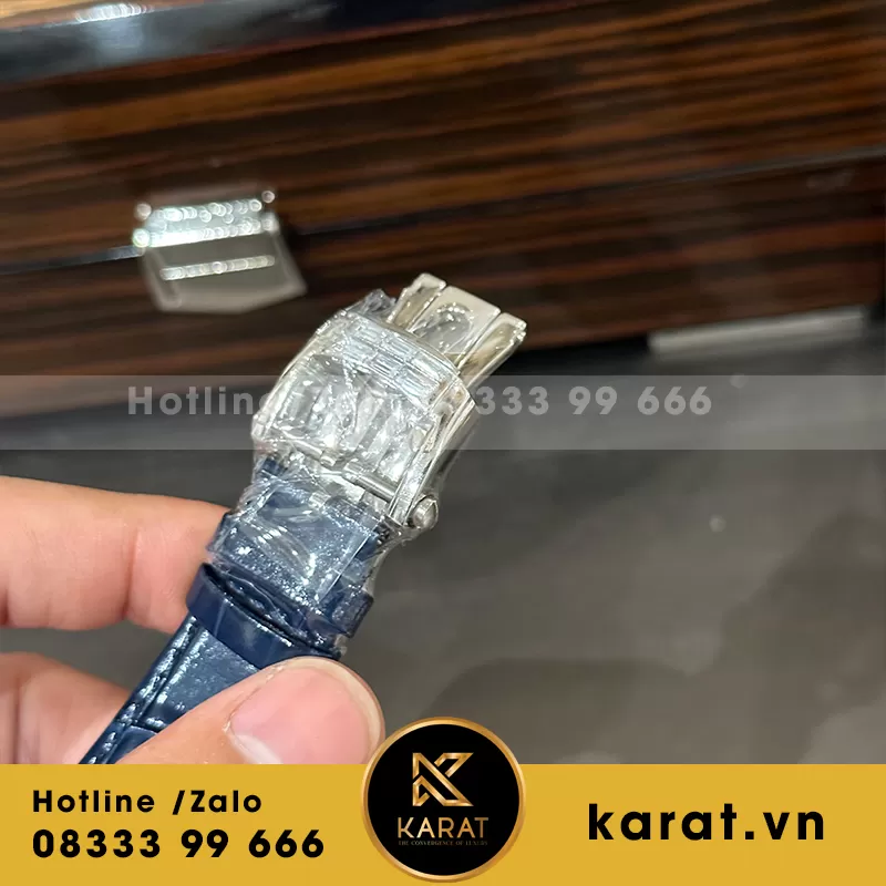 Dây da cá sấu navy blue cao cấp mềm mại, khóa gập white gold đính 6 viên diamonds (~0.8 ct) an toàn, ôm sát cổ tay thoải mái cho sử dụng linh hoạt.