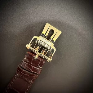 Dây cao su thể thao màu nâu sậm ôm tay mềm mại, phù hợp cả phong cách sang trọng lẫn năng động. Khóa gập vàng hồng 18K khắc logo hoa thị biểu tượng thương hiệu, tăng thêm phần tinh tế và an toàn khi đeo.