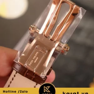 Dây đeo da cá sấu cao cấp, màu nâu đồng điệu với vỏ, khóa cài vàng hồng. Thiết kế thoải mái, linh hoạt, dễ thay thế, nâng tầm sự sang trọng mà không kém phần thực tế.