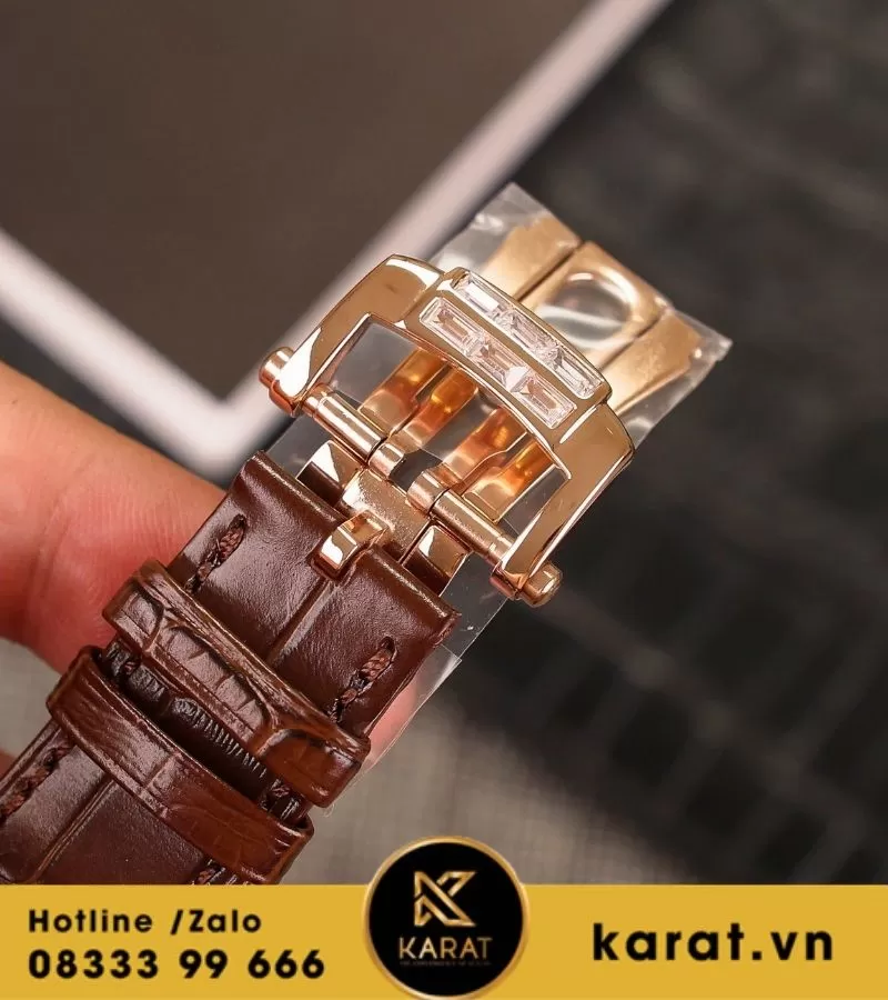 Bộ vỏ làm từ vàng hồng 18K, đường kính 40mm, được đính baguette diamonds trên bezel, tạo điểm nhấn lấp lánh. Lưng kính sapphire trong suốt cho phép quan sát bộ máy, cùng núm vặn vít chống nước đến 120m. Thiết kế này đảm bảo độ bền cao, phù hợp môi trường hàng ngày.