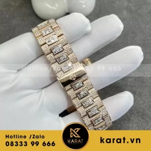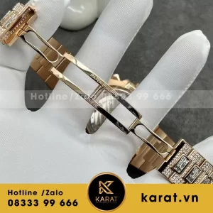 Dây kim loại mạ vàng hồng đính kim cương đồng bộ với vỏ, mang lại vẻ hài hòa và sang trọng tuyệt đối. Thiết kế ôm sát cổ tay, vừa chắc chắn vừa tạo cảm giác thoải mái khi đeo trong thời gian dài.