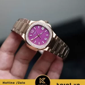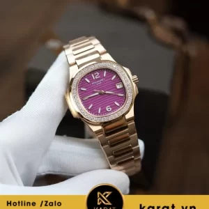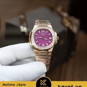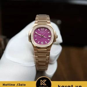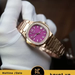 Patek Philippe Nautilus 7010/1R-013 là mẫu đồng hồ nữ cao cấp với thiết kế sang trọng, kết hợp giữa chất liệu vàng hồng 18K và mặt số màu tím sơn mài đặc trưng.