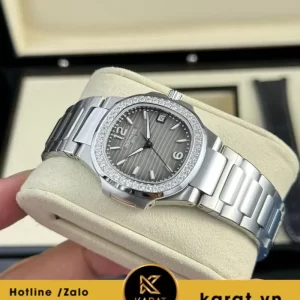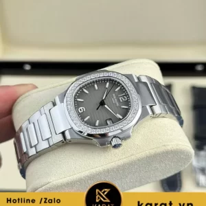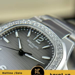 Đồng hồ Patek Philippe Nautilus 7010 mặt xám viền kim cương thuộc dòng Nautilus biểu tượng, ra mắt như lựa chọn lý tưởng cho phụ nữ yêu thích sự cân bằng giữa mạnh mẽ và nữ tính. Với kích thước 32mm nhỏ gọn, mẫu này giữ nguyên hình dáng porthole huyền thoại, phù hợp đeo linh hoạt từ văn phòng đến dạo phố.