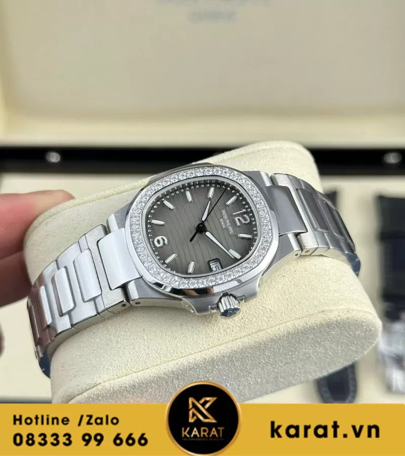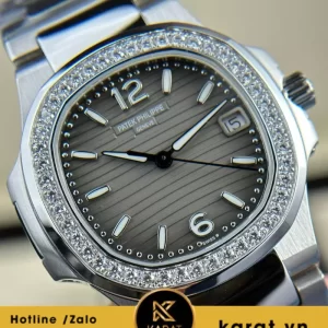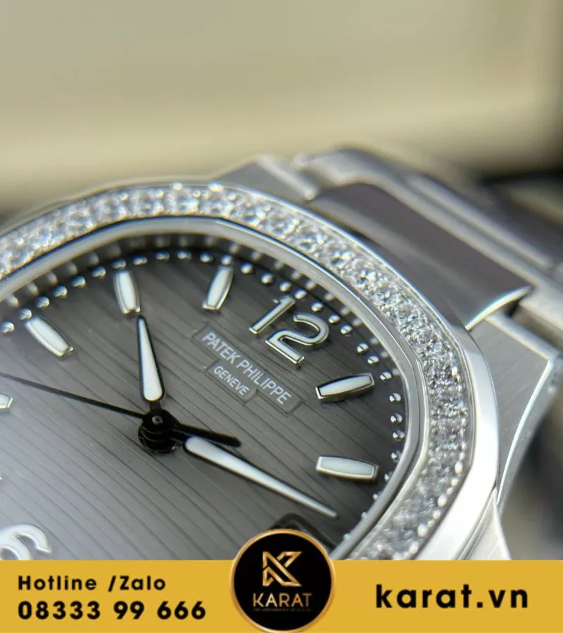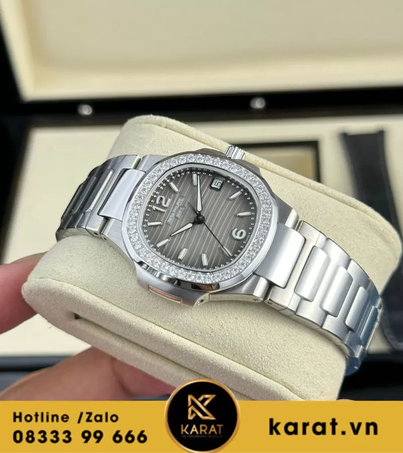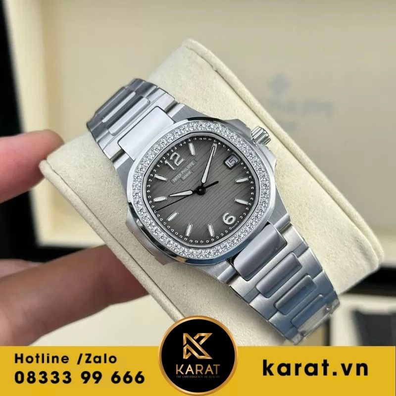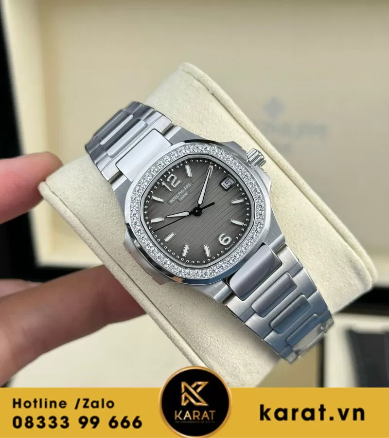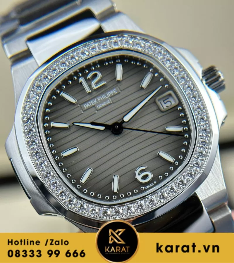 Karat.vn tự hào chế tác và phân phối đồng hồ Patek Philippe Nautilus 7010 mặt xám viền kim cương chất lượng cao, đi kèm bảo hành dài hạn, dịch vụ tư vấn cá nhân hóa. Khách hàng có thể dễ dàng sở hữu qua showroom hoặc mua online, kèm đầy đủ phụ kiện.
