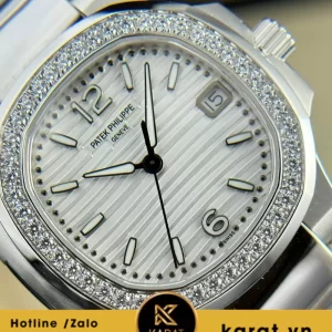 Đồng hồ Patek Philippe Nautilus 7010 vàng trắng viền kim cương kế thừa tinh hoa Gerald Genta, nổi bật với vỏ white gold 18K óng ả và chi tiết diamonds tinh xảo. Sản phẩm phù hợp cho lối sống năng động của phụ nữ hiện đại, từ dạo phố đến sự kiện.