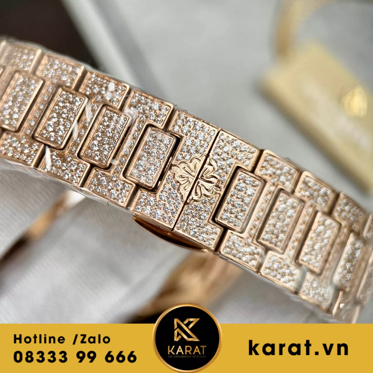 Vỏ đồng hồ kích thước 40mm được chế tác từ thép không gỉ cao cấp, phủ đầy đá CZ lấp lánh, phản chiếu ánh sáng rực rỡ từ mọi góc nhìn. Form vỏ đặc trưng Nautilus với các đường cong uốn nhẹ, ôm sát cổ tay, tạo cảm giác thoải mái khi đeo nhưng vẫn giữ nét quyền quý và thời thượng.