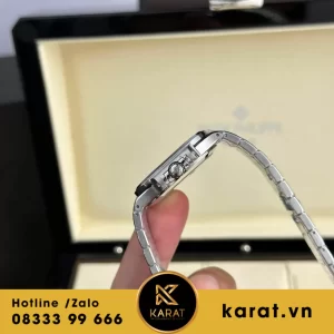 Vỏ thép không gỉ 316L đường kính 35.2mm, dày 8.62mm mang độ mỏng nhẹ nhàng, bezel đính đá xước 3K (tổng 0.5 carat) tạo điểm nhấn óng ánh, chống nước 30m phù hợp sử dụng đa dạng.