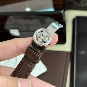 Dây da cá sấu nâu cao cấp mềm mại, khóa gập white gold an toàn, ôm sát cổ tay thoải mái khi sử dụng hàng ngày.
