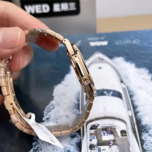 Vỏ rose gold 18K nguyên khối đường kính 40mm, dày 11.28mm mang cảm giác chắc tay, viền bezel đính 44 viên kim cương baguette (tổng 1.5 carat) tạo điểm nhấn rực rỡ, chống nước 120m hiệu quả.
