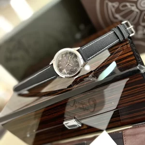 Dây da bê nubuck cao cấp tông đen viền be được khâu tỉ mỉ, ôm cổ tay nhẹ nhàng nhưng vẫn tạo cảm giác chắc chắn. Khóa cài khắc logo thương hiệu giúp người dùng dễ dàng nhận diện.