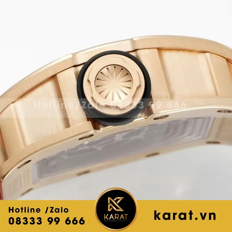 Bộ vỏ kích thước 40×48mm chế tác từ titanium phủ vàng hồng theo chuẩn Replica 1:1, cho cảm giác sang trọng và độ bền cao. Bề mặt được hoàn thiện sắc nét, tái hiện đúng phong thái thể thao của dòng RM. Ốc titanium đặc trưng kết hợp kính sapphire cong chống trầy tạo nên tổng thể chắc chắn và đậm chất cao cấp.
