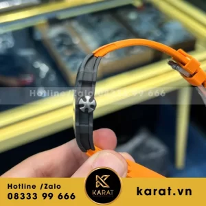 Phiên bản vỏ Carbon TPT nổi bật với vân xám trắng tự nhiên trên nền đen, kết hợp viền cam cam rực rỡ chạy quanh khung, tạo hiệu ứng thị giác nổi bật. Thiết kế cong ôm tay, kích thước 47.25 x 38.7mm, mang lại cảm giác đeo nhẹ chỉ hơn 30 gram nhưng vẫn chắc chắn và sang trọng.