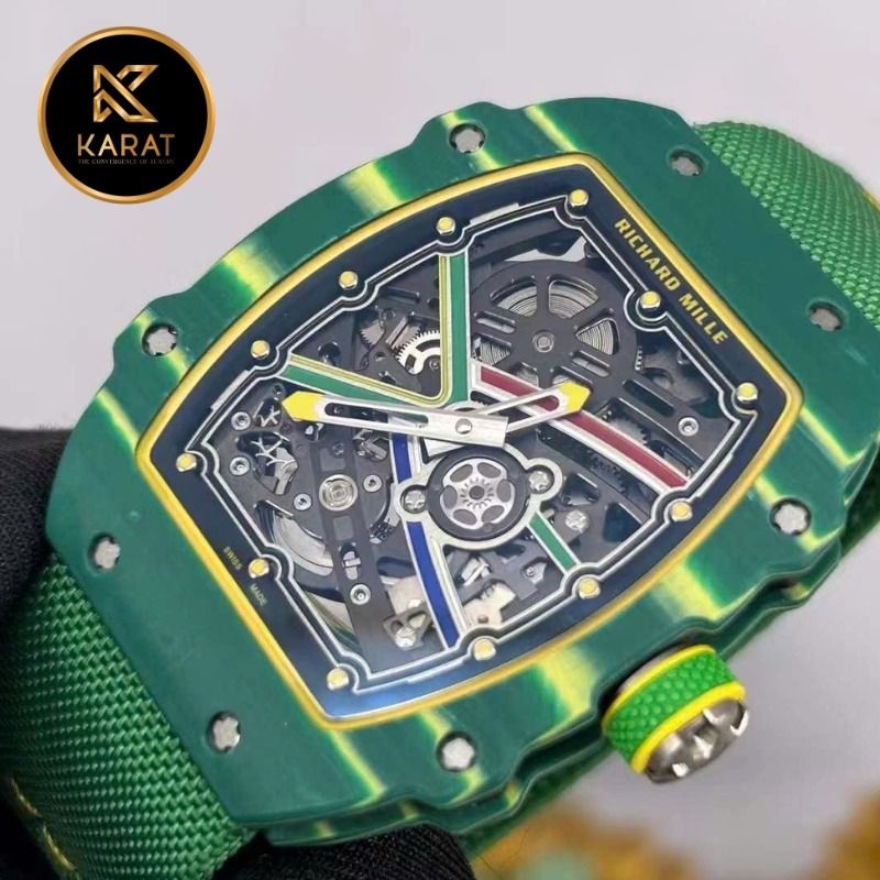 Chiếc RM67-02 sở hữu vỏ carbon xanh TPT – chất liệu siêu nhẹ, bền bỉ và chống trầy xước vượt trội. Với độ dày chỉ 7.8mm, khung vỏ tonneau ôm sát cổ tay, tạo cảm giác thoải mái nhưng cực kỳ sang trọng. Các vân carbon xen kẽ sắc xanh tạo hiệu ứng thị giác mạnh mẽ, biểu tượng cho tinh thần thể thao đỉnh cao.